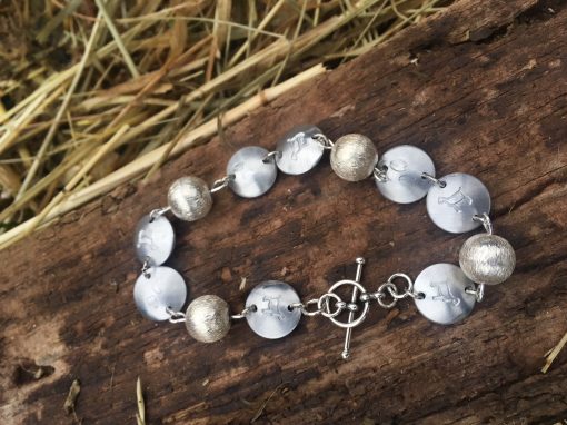 This handmade bracelet is made with aluminum discs and silver metal round beads. It also features a sterling silver toggle clasp. Each aluminum disc is hammered by hand making them unique and one-of-a-kind. Each bracelet has between 6-8 aluminum discs with a design hammered on each one.